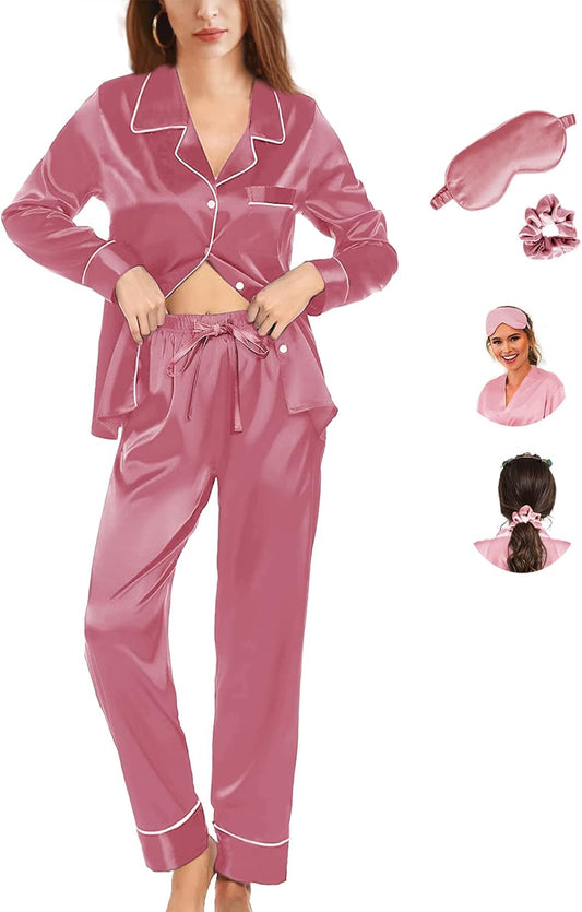 Womens Pajama Set Silk Satin Pajamas Long 2pc Pjs Button Down Sleepwear Pj Set Loungewear