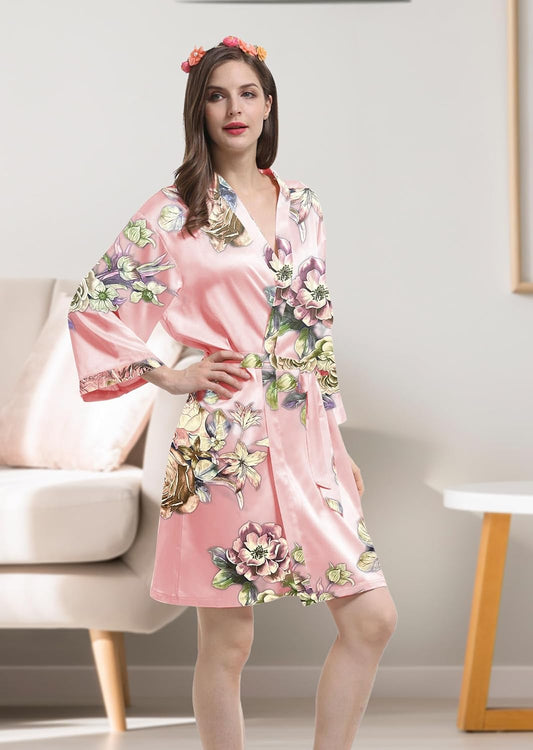 Womens Satin Kimono Robe Silk Robes Floral Bathrobe Bride Bridesmaid Wedding Silky Bridal Dressing Gown Loungewear
